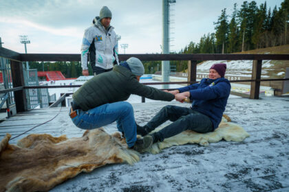 Специально для гостей югорской столицы мастер-класс по национальным северным видам спорта провел президент Федерации северного многоборья Югры Константин Соловьев. Представители казахстанских СМИ попробовали себя в перетягивании палки, метании тынзаня на хорей и прыжках через нарты.